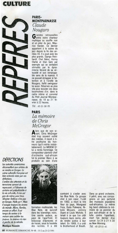 - Photocopied article from the French newspaper l'Humanité Dimanche about a concert at the music festival MIDEM 91 in memory of Chris McGregor. A photo of Chris McGregor is also accompanying this article.