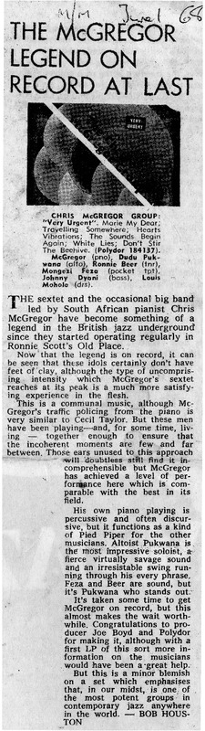 - Photocopied article about Chris McGregor's recording "Very Urgent". There is a picture of the LP'S cover with this article.