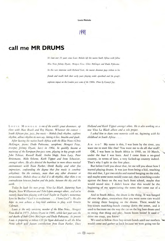 - Photocopied article from Wire Magazine about Louis Moholo. "It's been over 25 years since Louis Moholo left his native South Africa with fellow Blue Notes Johnny Dyani, Mongezi Feza, Chris McGregor and Dudu Pukwana. In this rare interview with Richard Scott, the master drummer pays tribute to his friends and recalls both their early years playing under apartheid and the group's explosive impact on the London jazz scene of the 1960s."