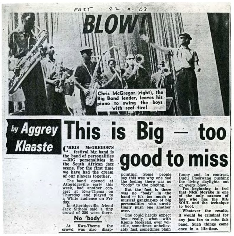 - Photocopied article from the newspaper The Post about Chris McGregor leading his Big Band at a Jazz Festival in South Africa. A picture of Chris McGregor (right) and his band playing on stage is also accompanying this article.
