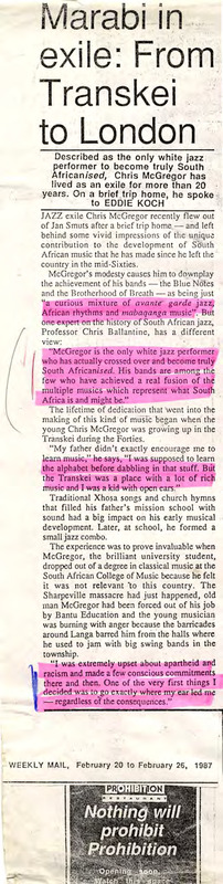 - Photocopied article from Weekly Mail (February 20-26, 1987) with 2 pictures of Chris McGregor. The picture on the left represents Chris McGregor at the beginning of Blue Notes and the right picture shows him more than 20 years later. " Described as the only white jazz performer to become truly South Africanised, Chris McGregor has lived as exile for more than 20 years."