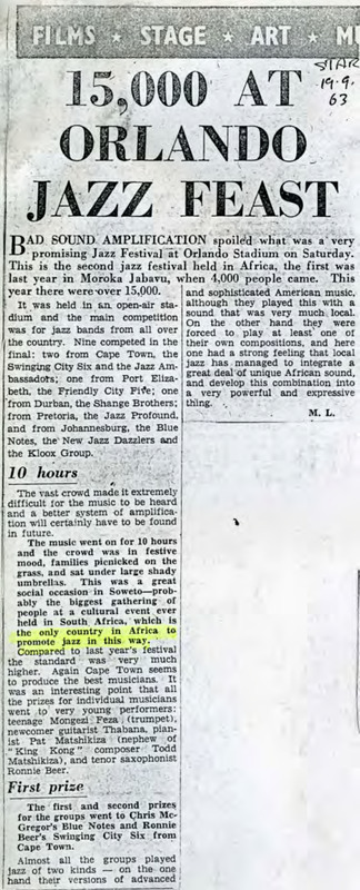 - Photocopied article from the South African newspaper Star about a Jazz Festival at Orlando Stadium. This was the second jazz festival held in South Africa where over 15000 people attended. Two prizes were awarded during the festival. The first prize went to Chris McGregor's Blue Note.
