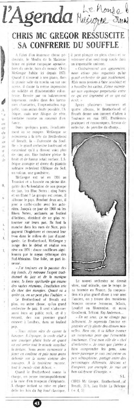 - Photocopied article from the French magazine Le Monde de la Musique about Chris McGregor resurrecting the band Brotherhood of Breath for touring France. There is a portrait of Chris McGregor with this article.
