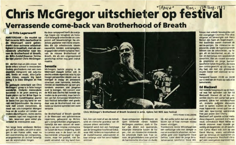 - Photocopied article from the Dutch newspaper Trouw about a concert by Chris McGregor and the Brotherhood of Breath at the NOS-Jazz Festival in Amsterdam, Holland . There is also a picture of Chris McGregor and 2 other musicians with this article.
