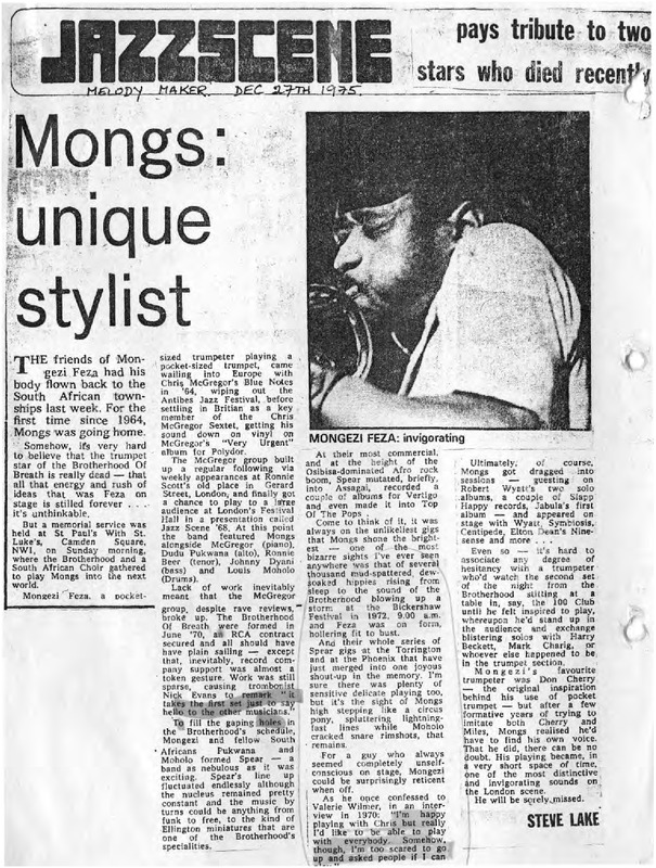 - Photocopied article from the newspaper Melody Maker about Mongezi Feza's death. There is a portrait of Mongezi Feza playing trumpet.
