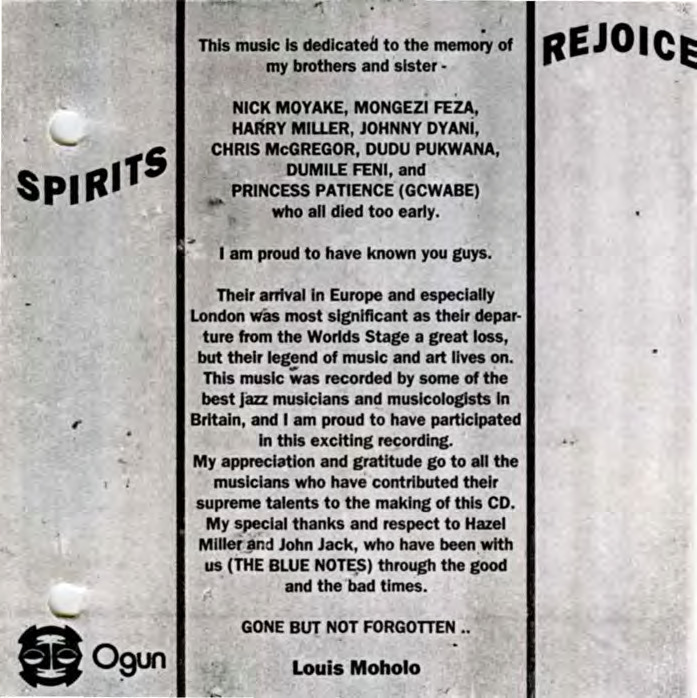 - Photocopied album cover of Spirits/Rejoice. On the first page Louis Moholo is dedicating the "music to the memory of [his] brothers and sister". On the second page, from left to right, a photo of Dudu Pukwana, Mongezi Feza and Harry Miller and on the third page, from left to right Johnny Dyani and Chris McGregor. On the fourth page there is a picture of Louis Moholo and on the last page a photo of the Blue Notes in 1964.
