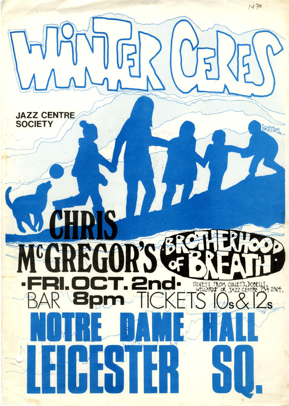 - Original poster for a concert by Chris McGregor's Brotherhood of Breath at Notre Dame Hall, Leicester Square, London, England.