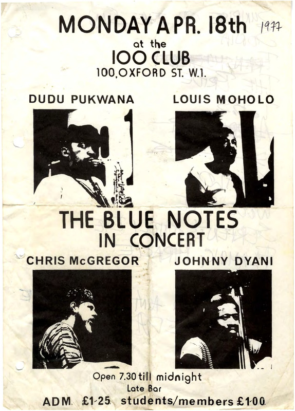 - Original poster announcing a concert by the Blue Notes at the 100 Club, London, England. There is a hand written list of song's titles at the back of the poster.
