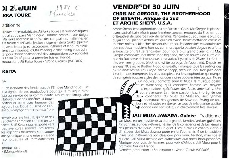 - Photocopied program for a music festival in Marseille, France with Chris McGregor, The Brotherhood of Breath and Archie Shepp.