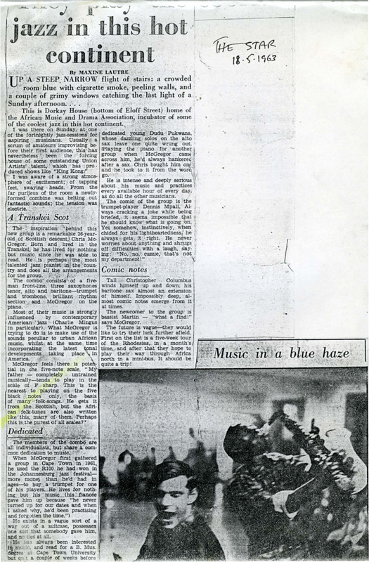 - Photocopied article from the newspaper The Star about a concert by Chris McGregor and the Blue Notes at the Dorkay House, at Eloff Street in Johannesburg, South Africa. There is a picture of Chris McGregor playing piano with Dudu Pukwana playing saxophone, with this article.