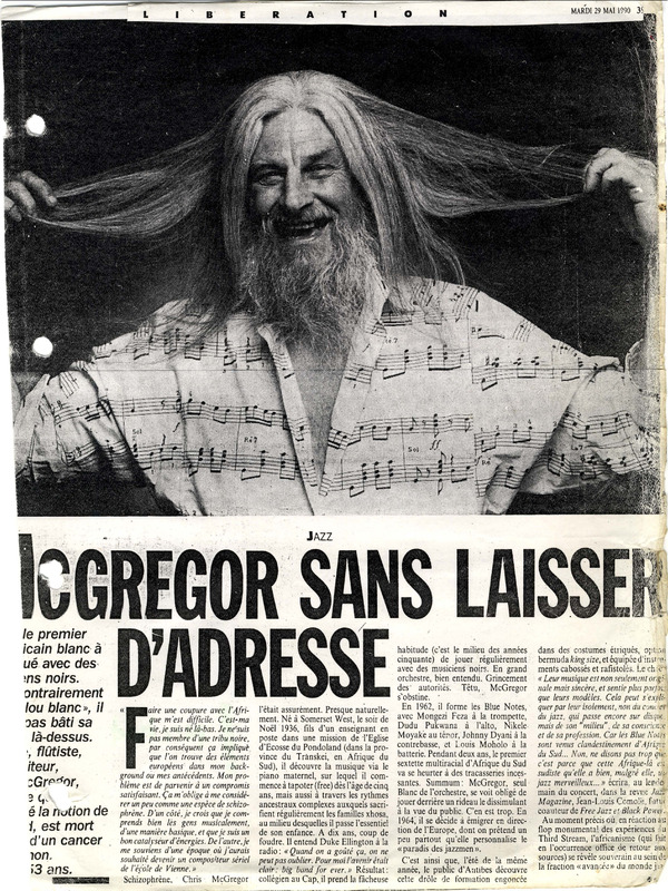 - Photocopied article from the French newspaper Libération about Chris McGregor's death. The author relates his life. A picture of Chris McGregor wearing a music notes shirt and pulling his hair is also accompanying the article.