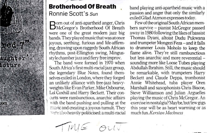- Photocopied article from Time Out London about the origins, the evolution and the musical influences of Brotherhood of Breath.