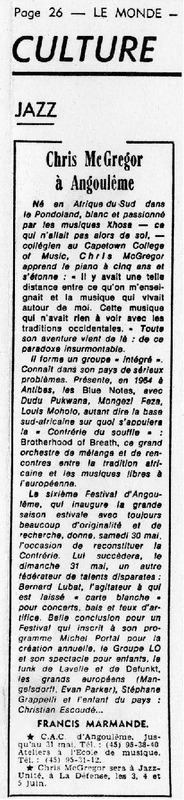 - Photocopied article from the French newspaper Le Monde about a concert by Chris McGregor's Blue Notes in Angoulême.