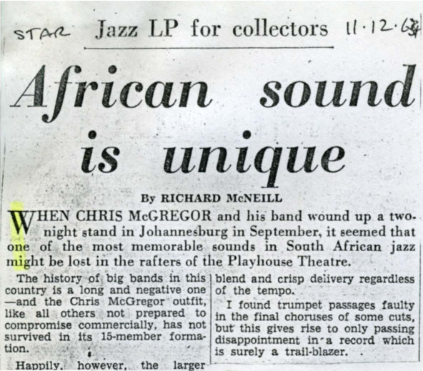 - Photocopied article from the newspaper The Star about the LP recordings "The African Sound", Gallotone, of Chris McGregor and the Castle Lager Big Band.