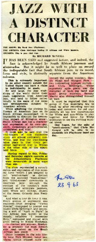 - Photocopied article from the newspaper The Star about South African jazz character, influences and styles.
