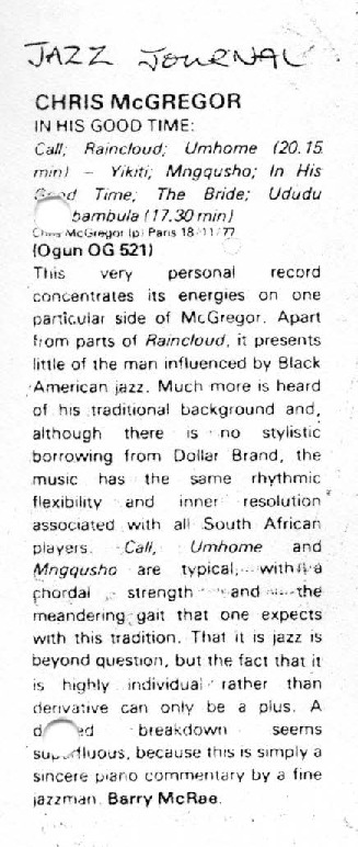 - Photocopied article from the magazine Jazz Journal about Chris McGregor piano solo recording "In His Good Time".