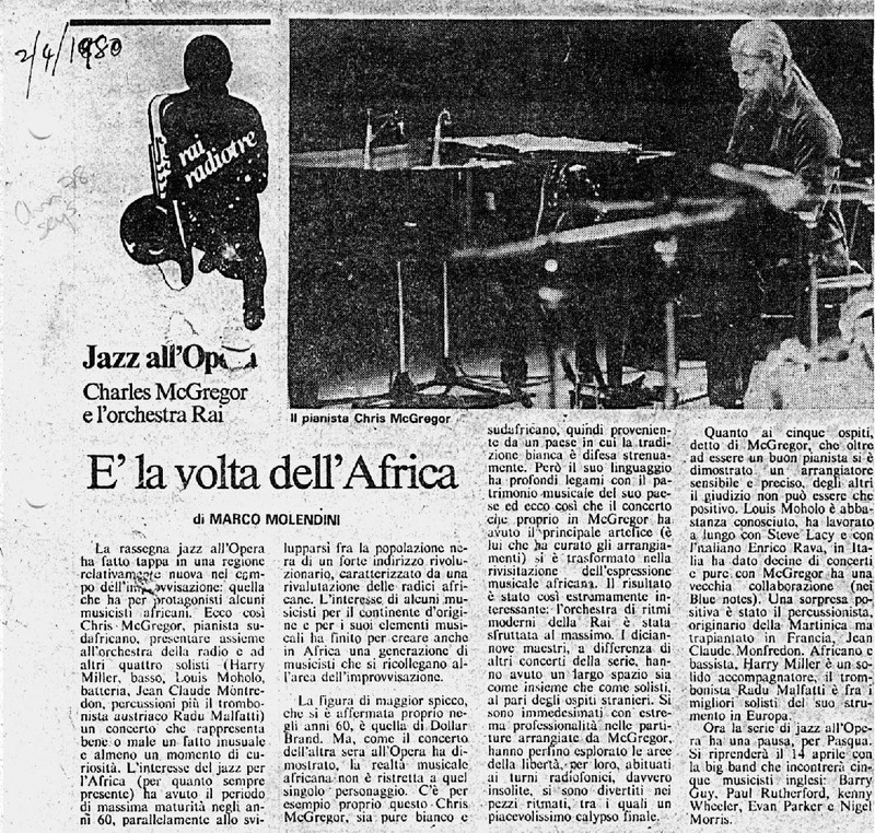 - Photocopied article in Italian about Chris McGregor and 4 musicians playing at the orchestra Rai for the Rai Radiaotre. There is a picture of Chris McGregor playing piano with this article.