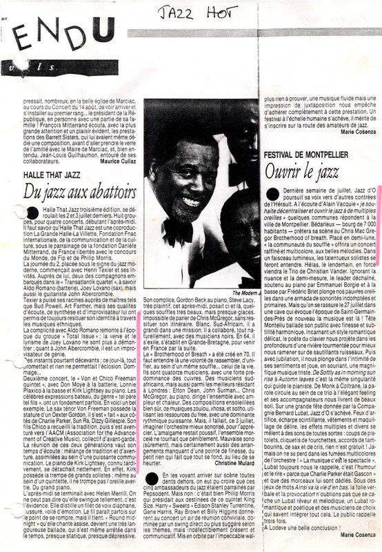 - Photocopied article from the magazine Jazz Hot about the festival "Halle That Jazz", France. Chris McGregor is taking part of the festival with the band Brotherhood of Breath. The organisers are planning to relocate the festival in other cities in France.