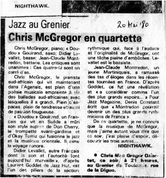 - Photocopied article from a French newspaper about a concert by Chris McGregor's Quartet in Toulouse, France.