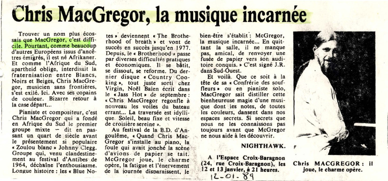 - Photocopied article in French about Chris McGregor's career with various bands and as a solo performer. The article is also announcing 2 coming concerts at l'Espace Croix-Baragnon, France. There is a picture of Chris McGregor playing Piano entitled "When he plays, he charms the audience".