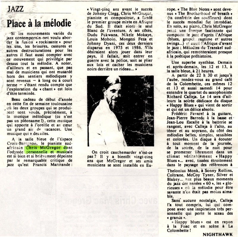 - Photocopied article in French about Chris McGregor, his music style and the various bands he took part of or created, such as Blue Notes and Brotherhood of Breath. There is a picture of Chris McGregor with the article.