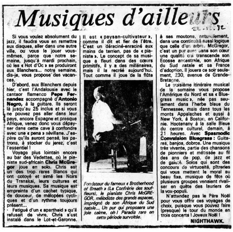 - Photocopied article in French about various concerts with music from all over the world, including a piano solo performance by Chris McGregor. There is a photo of Chris McGregor with this article.