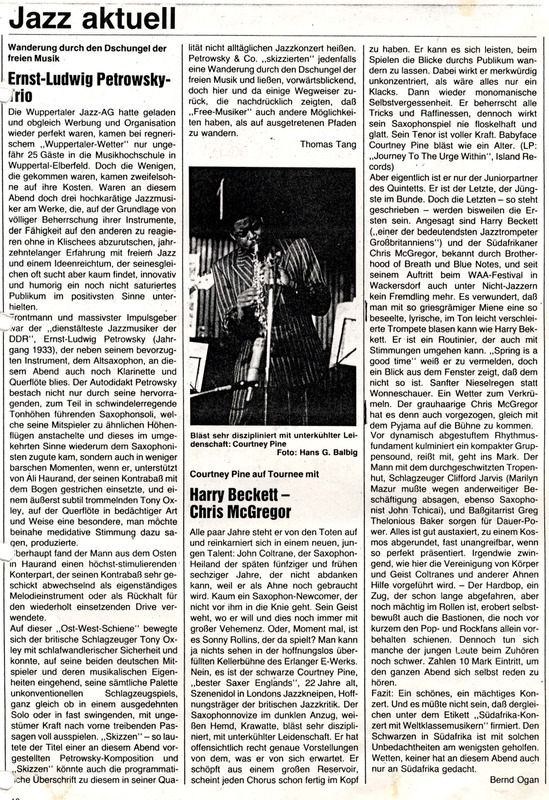 - Photocopied article from the German newspaper Jazz Aktuell about Courtney Pine, English Soprano Saxophone player on tour with Chris McGregor (Piano) and Harry Beckett (Trumpet). There is a photo of Courtney Pine with this article.