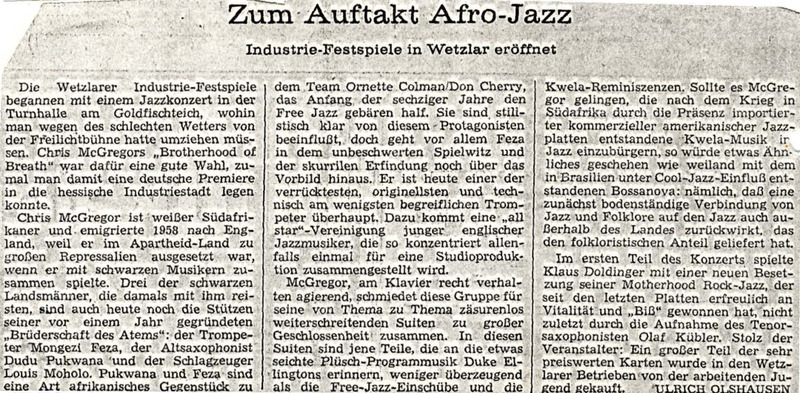 - Photocopied article from the German newspaper Frankfurter about the opening concert of the Wetzlar Festival with Chris McGregor and the Brotherhood of Breath.