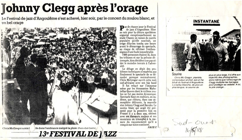 - Photocopied article from the French newspaper Sud-Ouest about a concert with Chris McGregor's Brotherhood of Breath, Johnny Clegg and the Mahotella Queens. "The Angoulême Jazz Festival ended yesterday evening with the concert of the White Zulu and a huge storm". There are also 2 pictures with the article. On the left, Chris McGregor and the Brotherhood of Breath on stage and on the right, Chris McGregor posing for he photographers in the empty stadium.