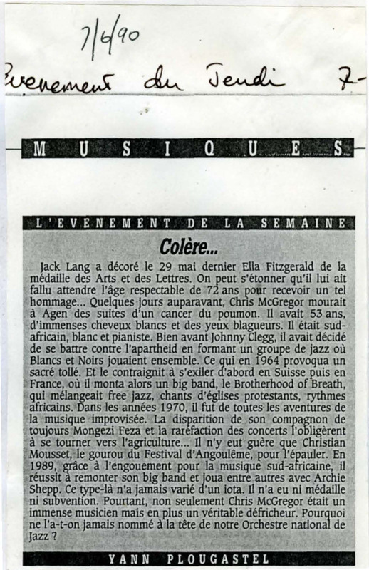 - Photocopied obituary of Chris McGregor from the French newspaper l'Evenement du Jeudi. The author is angry because Chris McGregor never got the lead of the French National Jazz Orchestra.