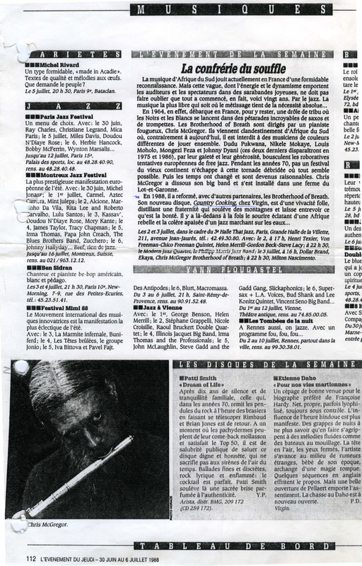- Photocopied article from the French newspaper L'Evénement du Jeudi about Chris McGregor and the Brotherhood of Breath and the release of their last recording "Country Cooking". There is also a picture of Chris McGregor playing flute with this article.