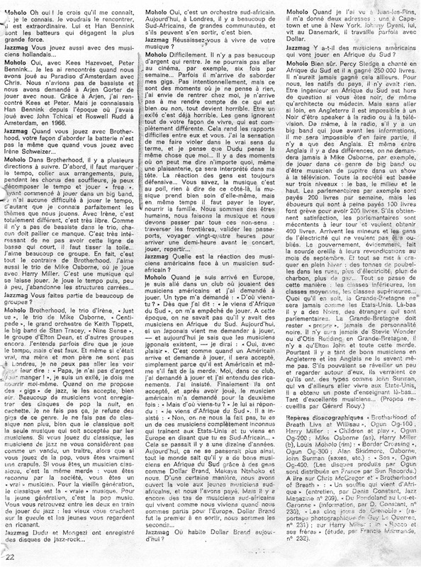 - Photocopied article in French from the magazine Jazzmag about Louis Moholo's exiled life in Europe and his music, bands, doubts and success.