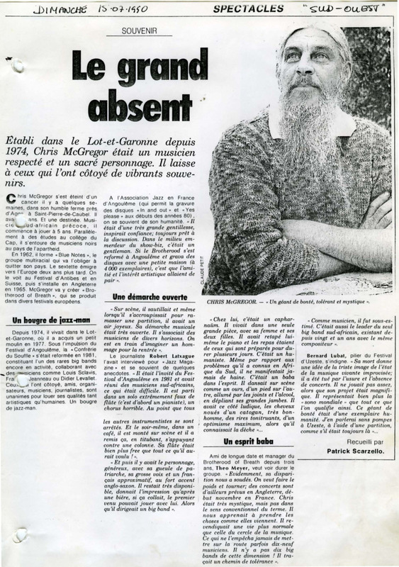 - Photocopied article from the French newspaper Sud-Ouest in memory of Chris McGregor. There is also a picture of Chris McGregor with the article.