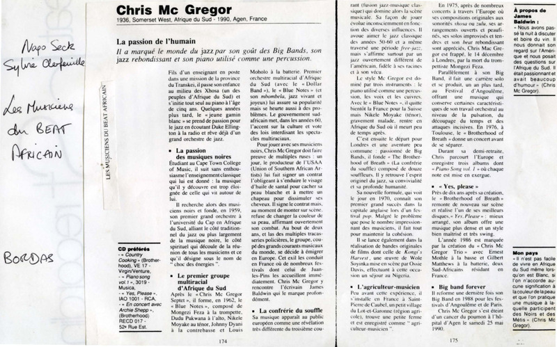 - Photocopied article from the French dictionary Les Musiciens du Beat Africain on Chris McGregor.