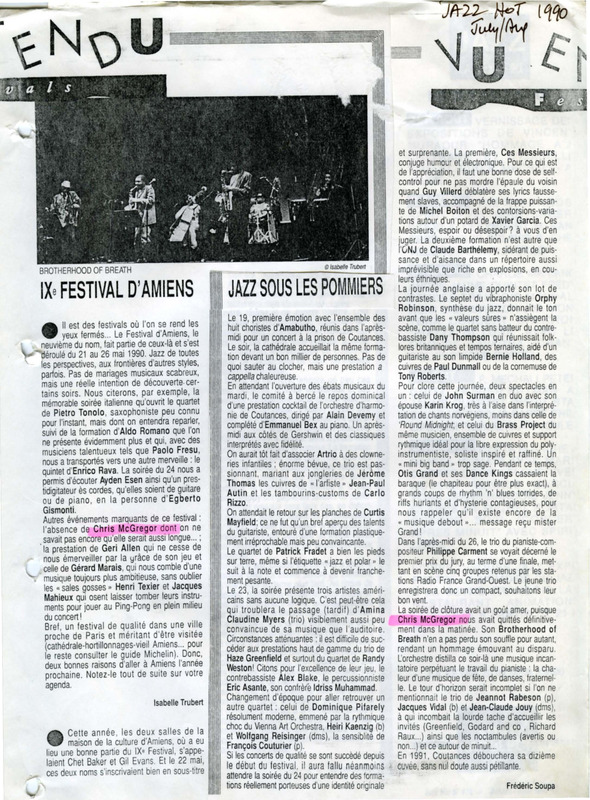 - Two photocopied articles from the French magazine Jazz Hot about the 9th music festival of Amiens, France. Chris McGregor was supposed to be playing at this festival, but died on the morning of his concert with the Brotherhood of Breath. A photo of the Brotherhood of Breath on stage is also accompanying the articles.