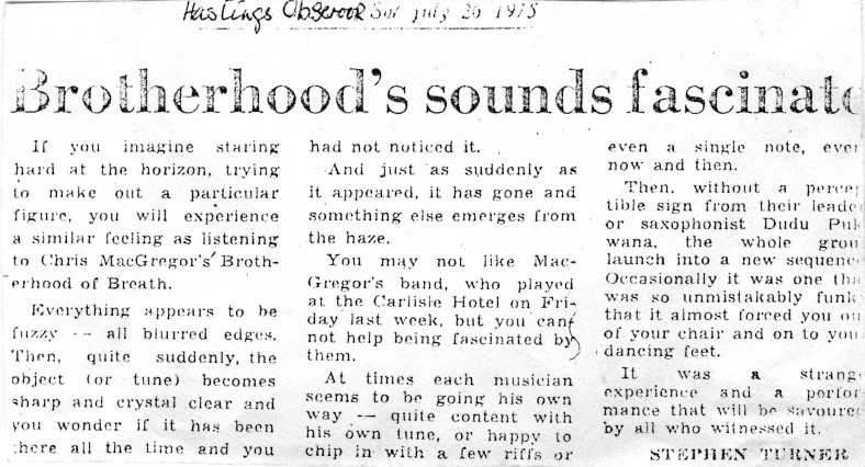 - Turner, Stephen (1975) Brotherhood's sounds fascinate. Hasting Observer .