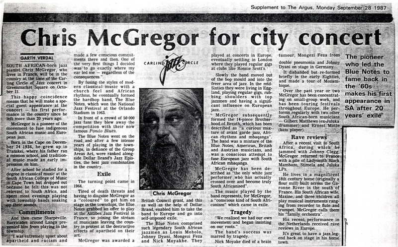 - Article from the Supplement to The Argus about Chris McGregor's return to South Africa for a concert at the Carling Jazz Circle Festival. "The pioneer who led the Blue Notes to fame back in the '60s makes his first appearance in SA after 20 years' exile." There is also a close up photo of Chris McGregor with the article.