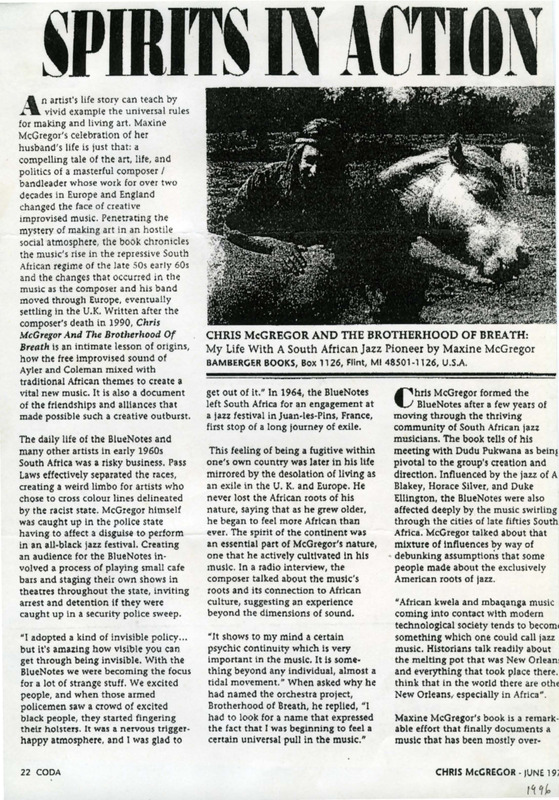 - Photocopied article from the magazine Coda. This article is based on the book written by Maxine McGregor, Chris McGregor's wife "My Life With A South African Jazz Pioneer" (Bamberger Books). The article is reviewing Chris McGregor's life and his relations with the other members of the band Blue Notes who exiled in Europe, such as Dudu Pukwana, Mongezi Feza, Louis Moholo or Nick Moyake. There are 4 pictures with this article. A photo of Chris McGregor outside with a horse is on the first page; on the second page there is a picture of the Blue Notes; a photo of Dudu Pukwana and Mongezi Feza is on the third page and on the last page, a photo is showing Louis Moholo (in the front) with the band Viva la Black.
