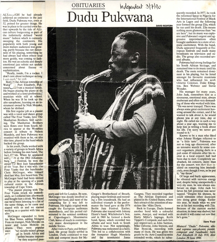 - Photocopied obituary of Dudu Pukwana from the newspaper The Independent. A picture of Dudu Pukwana occupies the center of the article.