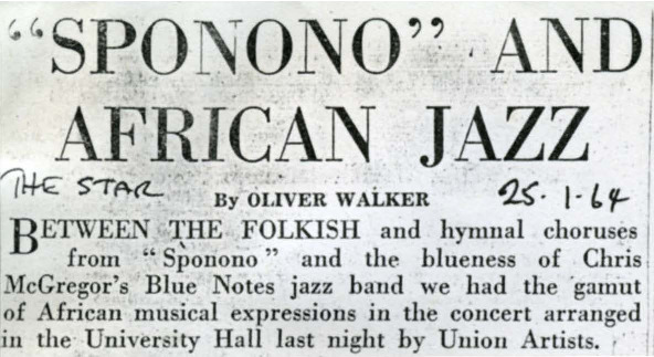 - Photocopied article from the newspaper The Star about a concert by Chris McGregor's Blue Note jazz band and hymnal choruses from Sponono, organized by Union Artists. 25 men and women shared folk musics and jazz on stage in the University Hall.