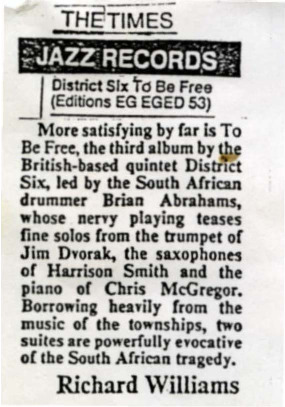 - Photocopied article from the newspaper The Times about the new recording of Brian Abrahams' Jazz Band District Six.