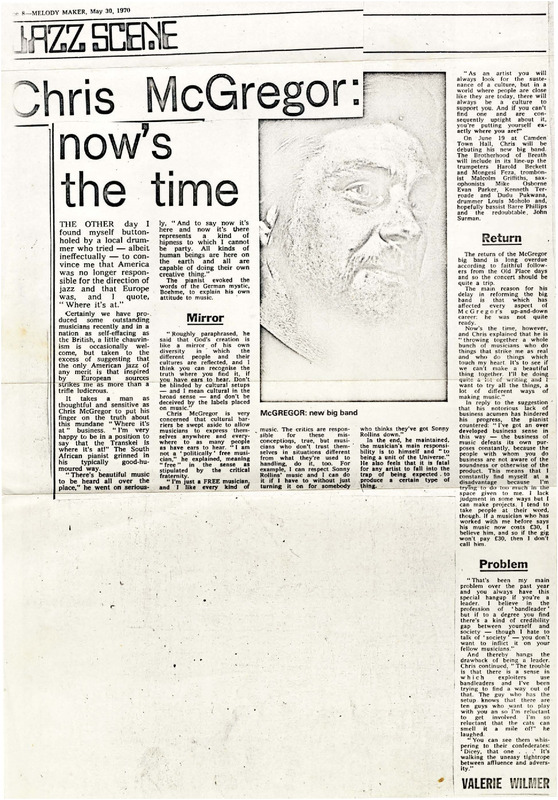 - Photocopied article from the newspaper Melody Maker about Chris McGregor's music and its influence on the new European jazz style. There is a portrait of Chris McGregor with this article.