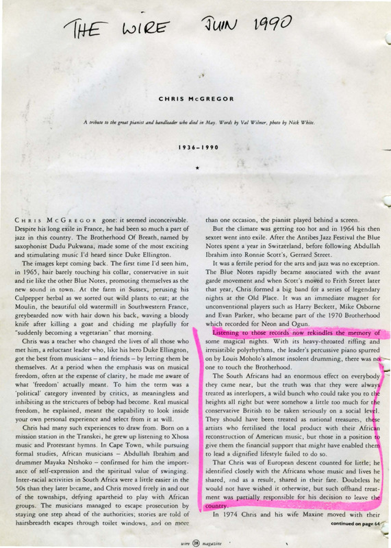 - Photocopied article from the Wire Magazine. "A Tribute to the pianist and bandleader who died in May". A picture of Chris McGregor is also with the article.