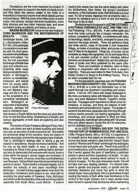 - Photocopied article form the magazine Cadence about Maxine McGregor's book "Chris McGregor and the Brotherhood of Breath". There is a picture of Chris McGregor with this article.