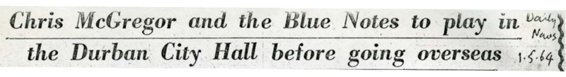 - (1964) Chris McGregor and the Blue Notes to play in the Durban City Hall before going overseas. The Daily News .