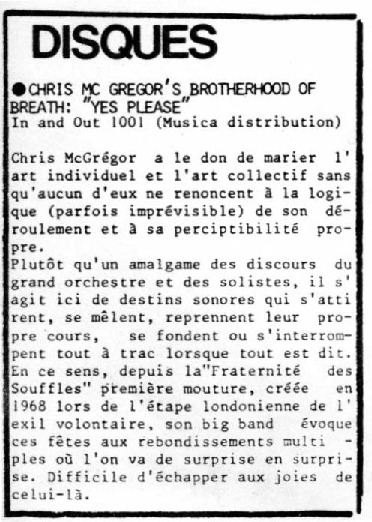 - Photocopied article about the recording "Yes please" (Musica distribution) by Chris McGregor's Brotherhood of Breath.