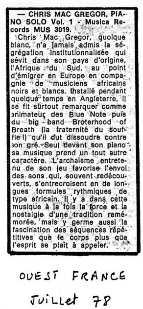 - (1978) Chris McGregor, Piano solo. Ouest France.
