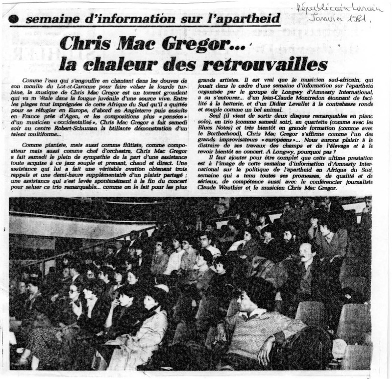- (1981) Chris McGregor... Warm reunion. Républicain Lorrain.