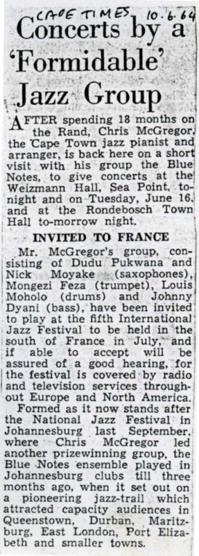 - Photocopied article from the South African newspaper Cape Times about Chris McGregor's Blue Notes and their concerts in Cape Town before heading for France to play at the 5th International Jazz Festival of Antibes.