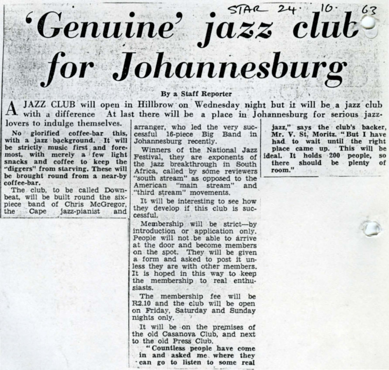 - (1963) "Genuine" jazz club for Johannesburg. The Star.